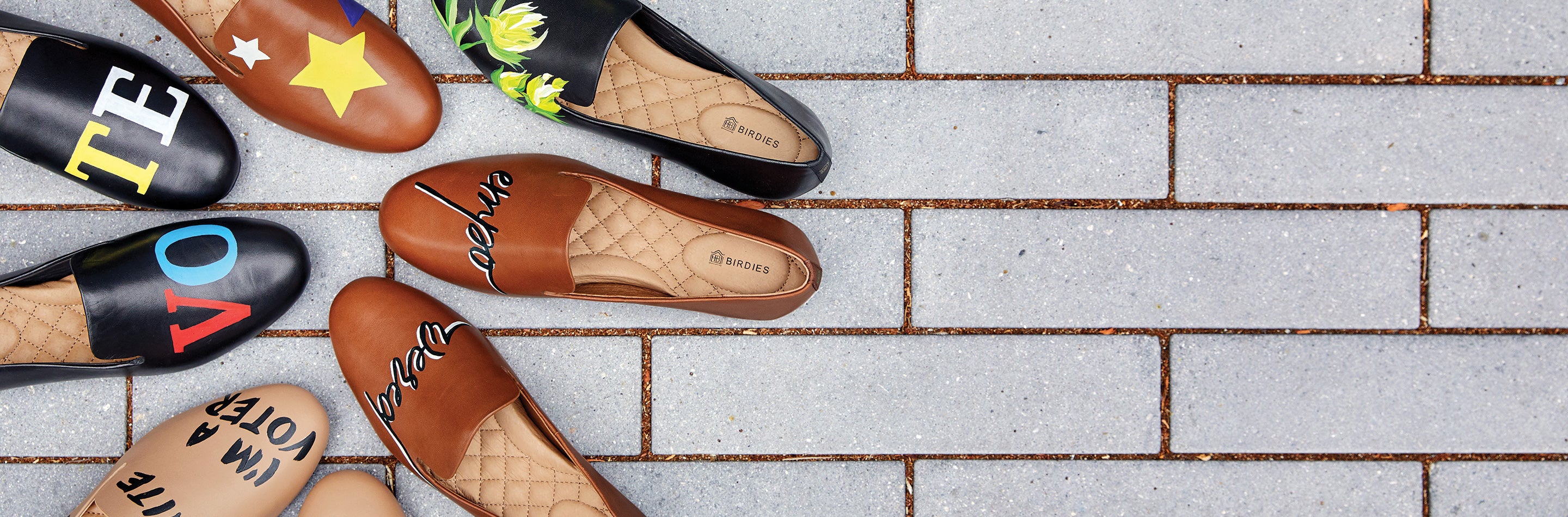 Birdies believes in the power of all women's voices. We've teamed up with creative studio, Leftys Right Mind, to create a limited-edition capsule collection of hand-painted leather flats to raise awareness and encourage all women to register to vote.