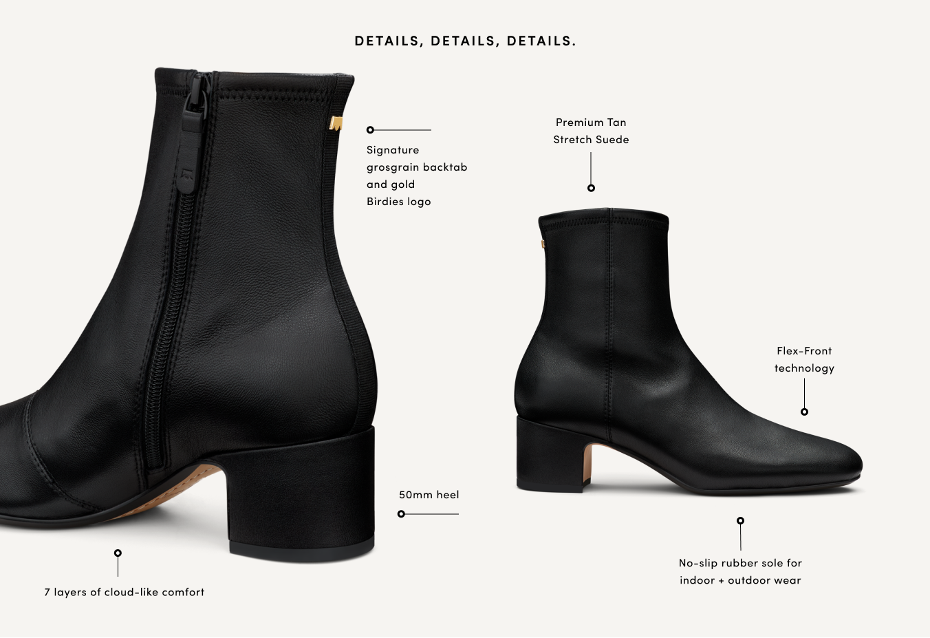 Black Stretch LeatherIntroducing our first-ever boot, a chic evolution of our best-selling smoking slipper. Crafted of premium black stretch leather, this classic ankle bootie features a walkable 50mm heel for an elongating lift. Thanks to our signature Flex-Front technology and footbeds with 7 layers of cloud-like comfort, enjoy a glove-like fit and endless comfort. The interior zipper and grosgrain back tab add a touch of convenience and refinement. Whether dressing up or keeping it casual, the Starling 50 Bootie is your go-to for versatile, cool-weather style.